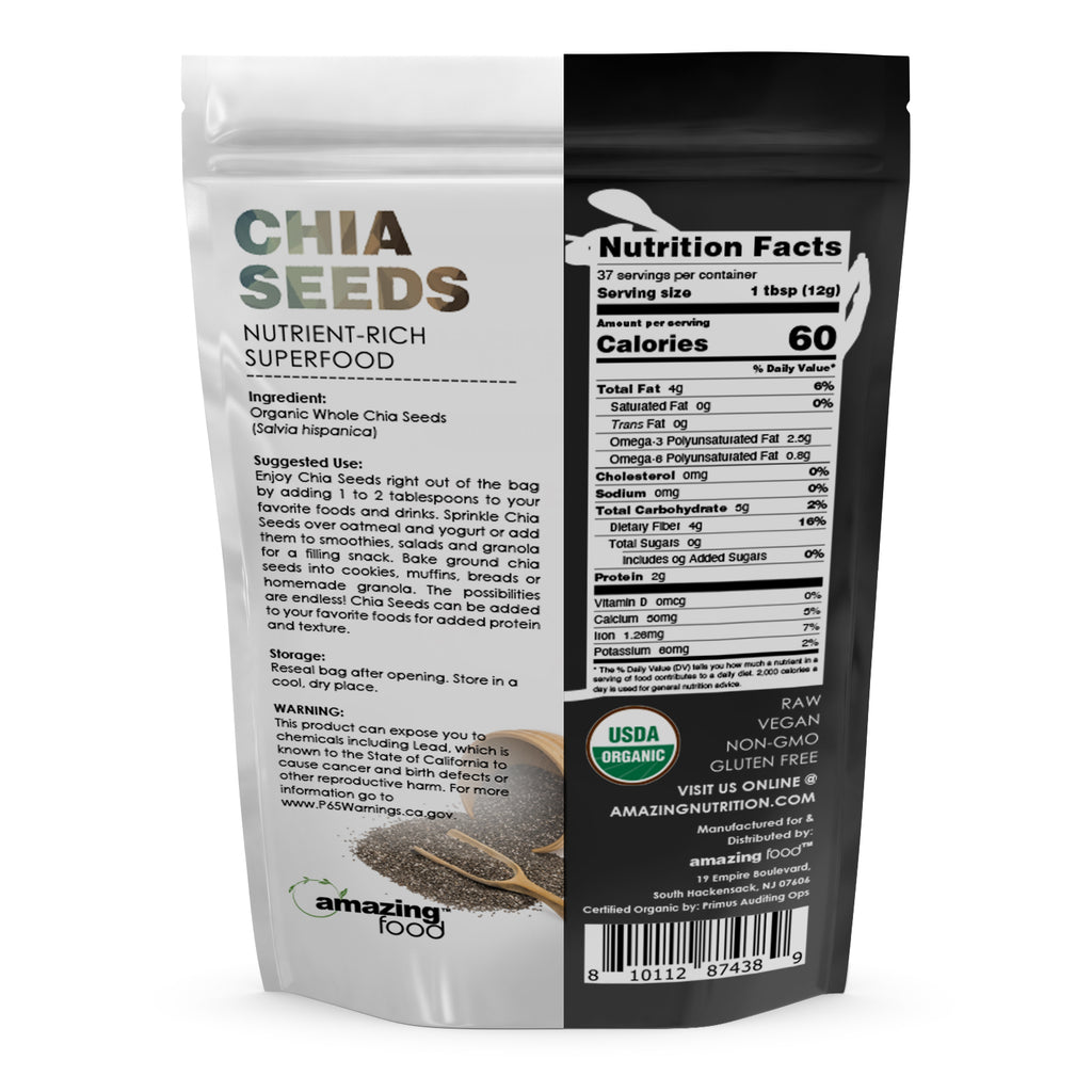 Amazing Food Chia Seeds | 1 LB | 12 Grams per Serving | 37 Servings | USDA Organic