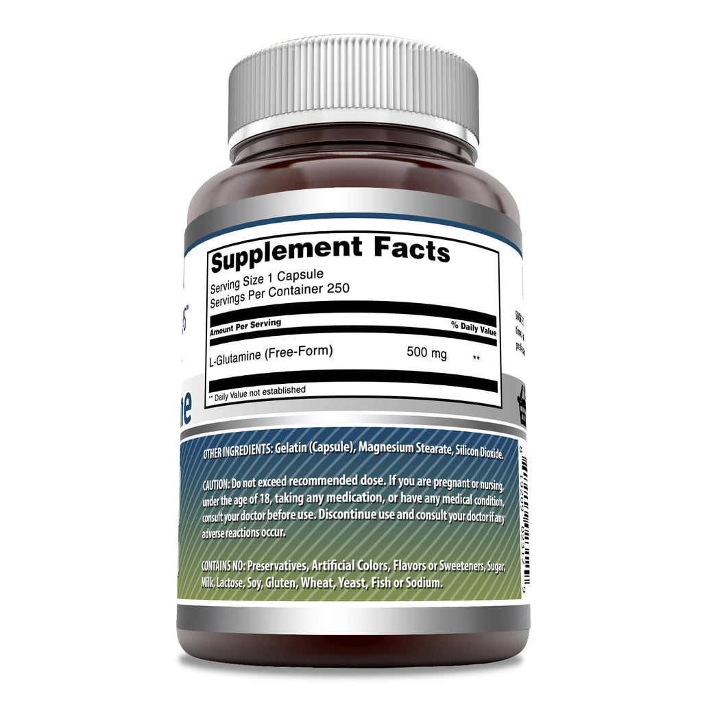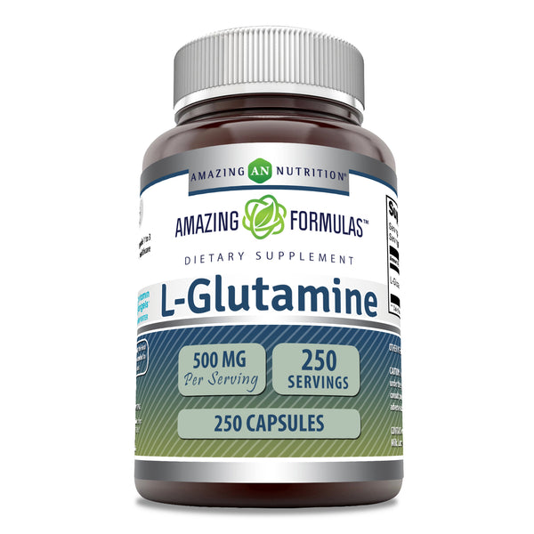 Amazing Formulas L-Glutamine Dietary Supplement provides 500 milligrams of the L-Glutamine in each of the 250 capsules.