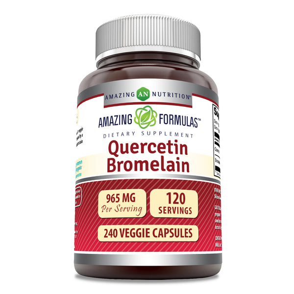 Quercetin and bromelain work well together; Quercetin works on an antioxidant level to neutralize the effect of free radicals while also suppressing histamine response (that which causes allergic reactions). Bromelain works on an enzyme and protein level, limiting the action of metabolites and neutrophils on inflammation. Additionally, bromelain assists in increasing your body’s absorption and utilization of quercetin. When taken regularly, Quercetin-Bromelain supports cardiovascular health, respiratory health, support healthy aging, improve energy production, stamina and inflammatory response supporting overall well-being. * Amazing Nutrition Quercetin- Bromelain dietary supplement has 800 Mg of Quercetin with 165 Mg Bromelain in every serving size of 2 Veggie Capsules.