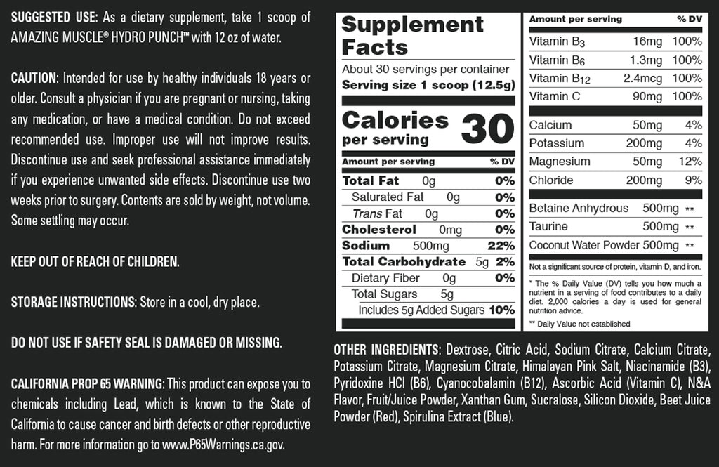 Amazing Muscle Hydro Punch | Hydration + Electrolyte Blend | Pre-Intro & Post Workout Powder Supplement | 30 Servings | Blueberry Pomegranate Blast Flavor